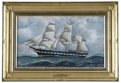ANTONIO NICOLO GASPARO JACOBSEN (American, 1850-1921) SHIP PORTRAIT OF THE “SOUTHAMPTON”. Oil on board ship portrait shows the three-mast black hulled ship in full sail sailing right to left in heavy sea. The waves are green and blue with white tips under a blue and cloud sky. Fourteen figures are seen on deck with the ships name emblazoned in gold on the bow. Signed lower right “Antonio Jacobsen 1918”. Housed in a good gilt molded wood replacement frame. SIZE: 12” x 20”. CONDITION: Very good, some inpainting. 9-27909