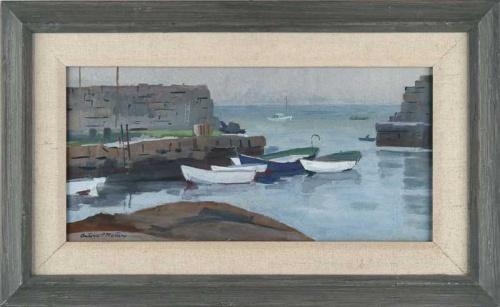 ANTONIO PIETRO MARTINO (American, 1902-1989) PIGEON COVE, ROCKPORT. Oil on board scene shows a granite enclosed small harbor with rowboats moored on calm water. A lobster boat is seen outside of entrance with a figure in a rowboat. Signed lower left. Housed in its original painted wood frame with linen liner. SIZE: 10" x 20". CONDITION: Very good. 9-27778