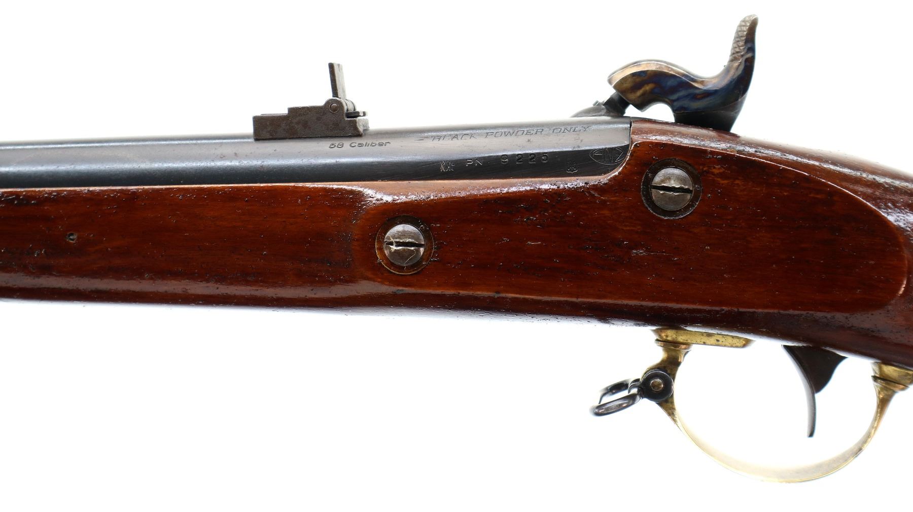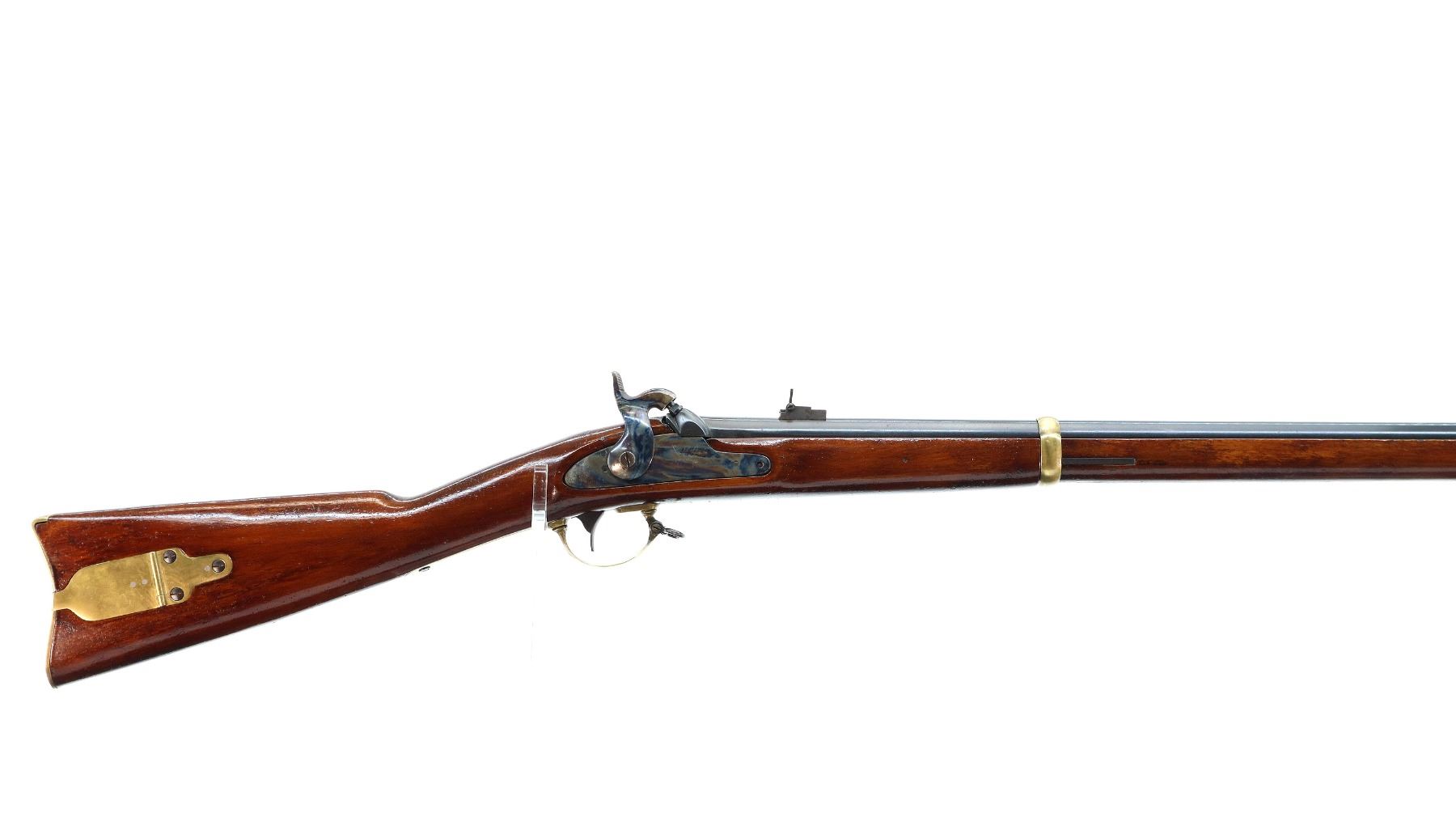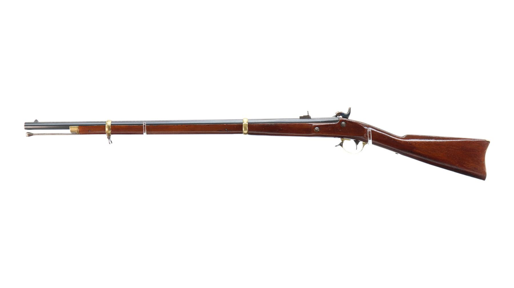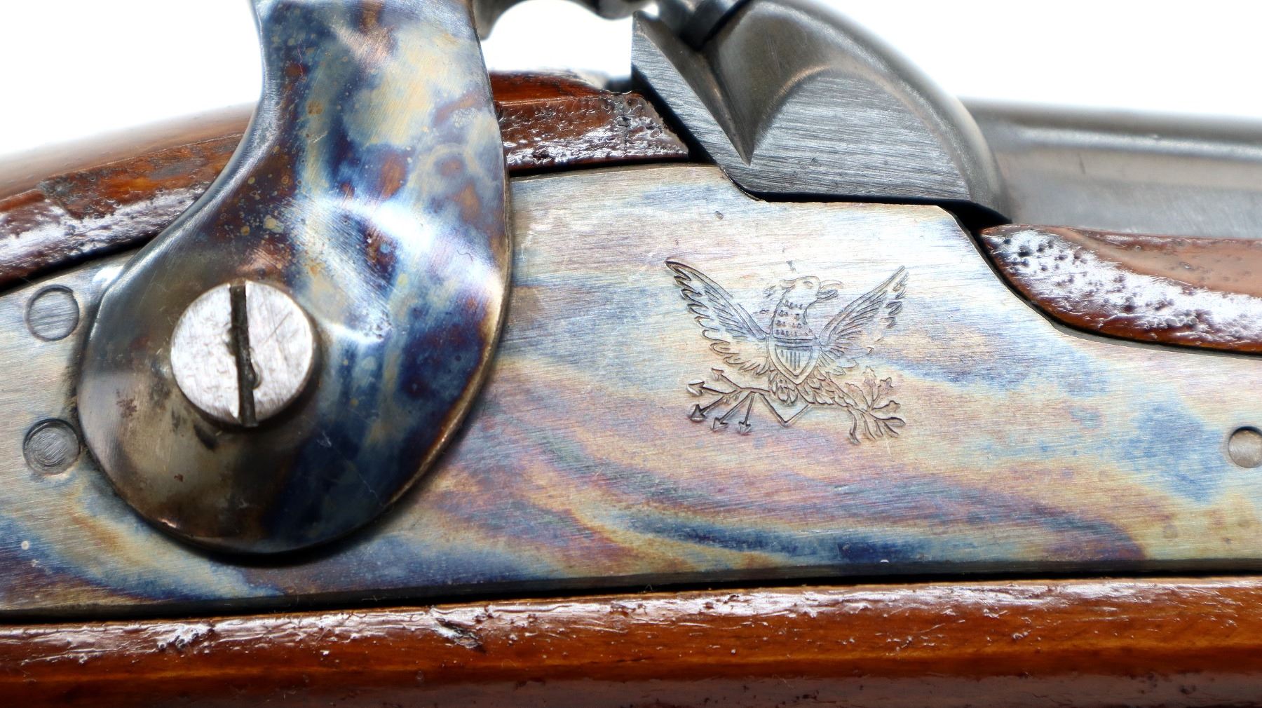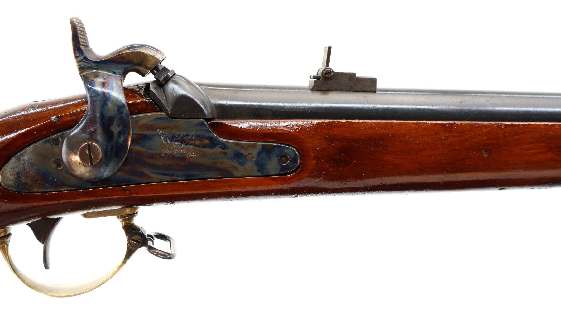 Main Description: Blade front sight with ramp, adjustable u notched rear sight with three folding leafs, blued finish, colour case hardened lock with US style Eagle and checkered spur hammer that functions, uses musket caps. One piece full military wood stock, straight grip, smooth brass butt plate, patch box, trigger guard, two barrel bands and nose cap. Sling swivels, ramrod and bayonet lug.