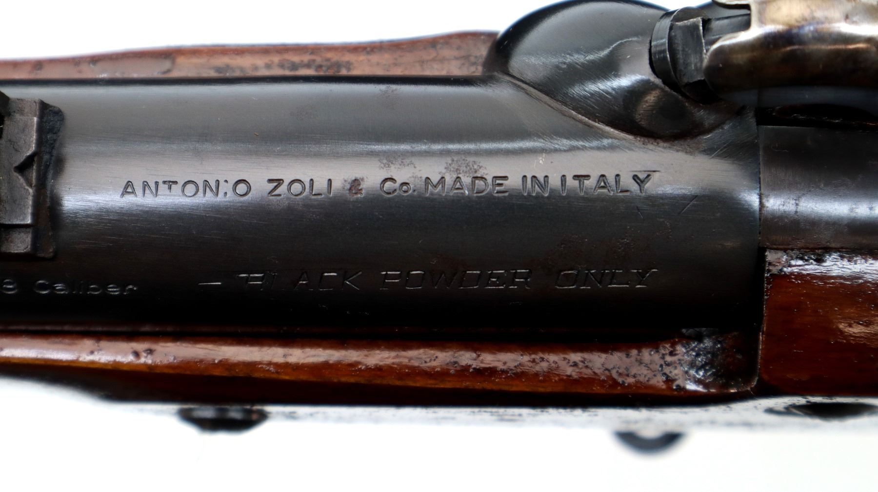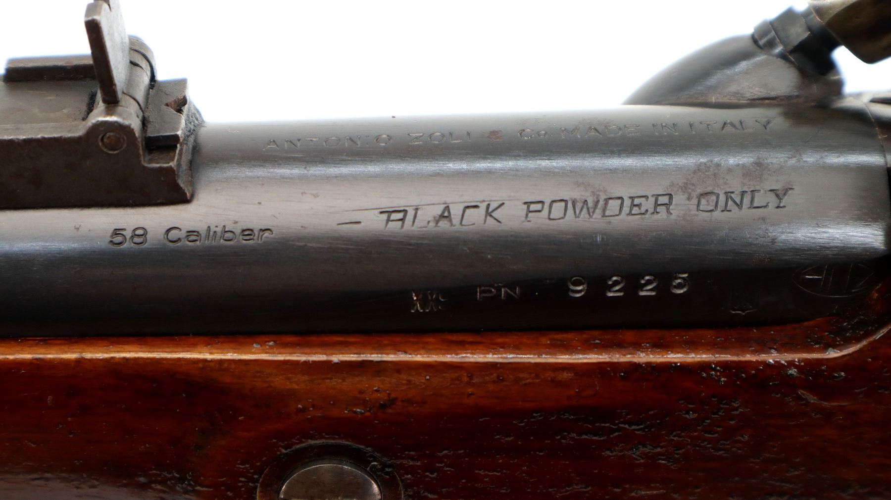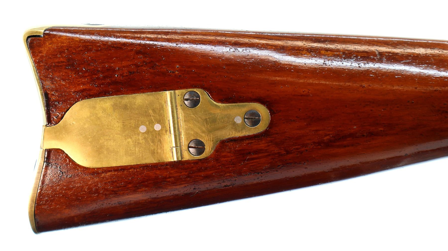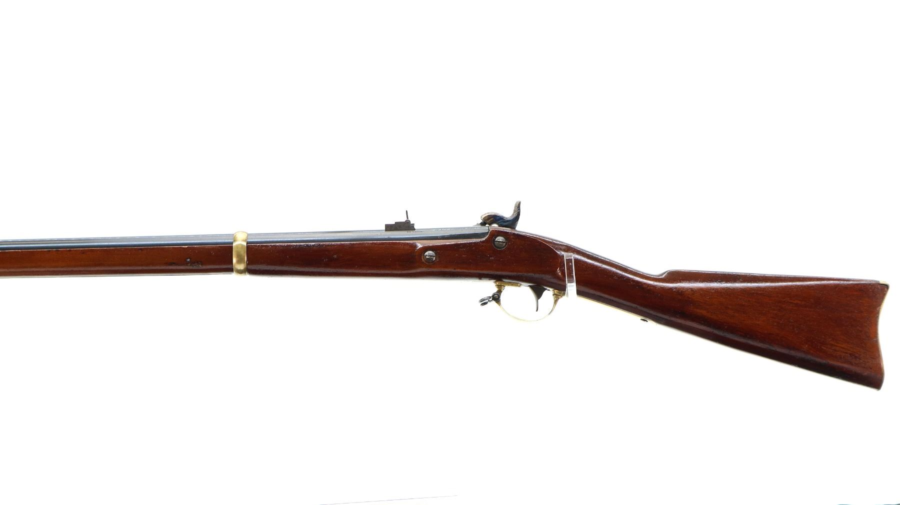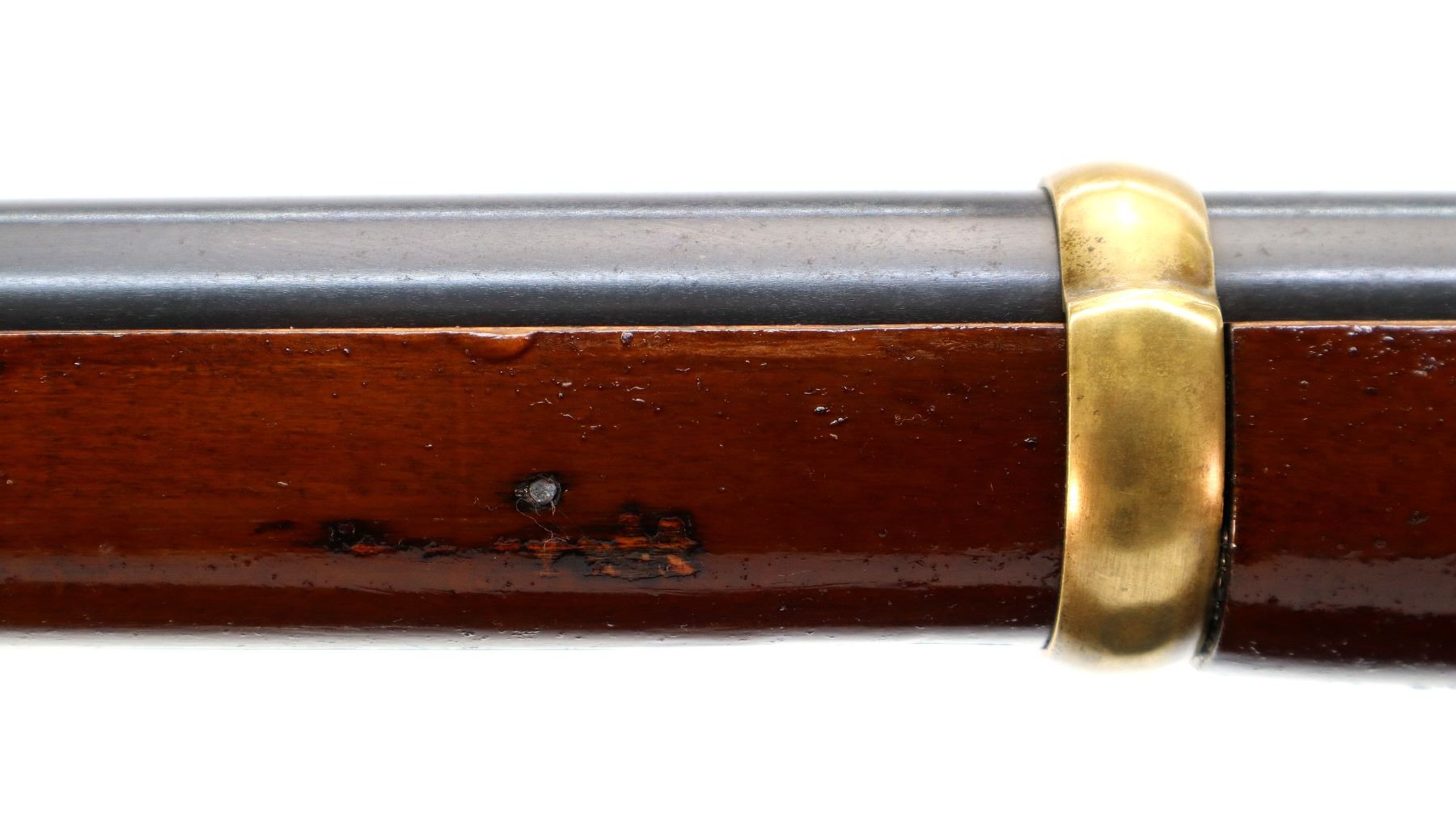 Main Description: Blade front sight with ramp, adjustable u notched rear sight with three folding leafs, blued finish, colour case hardened lock with US style Eagle and checkered spur hammer that functions, uses musket caps. One piece full military wood stock, straight grip, smooth brass butt plate, patch box, trigger guard, two barrel bands and nose cap. Sling swivels, ramrod and bayonet lug.
