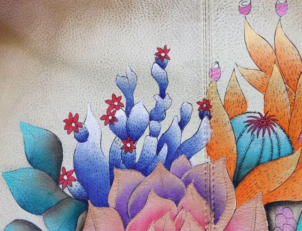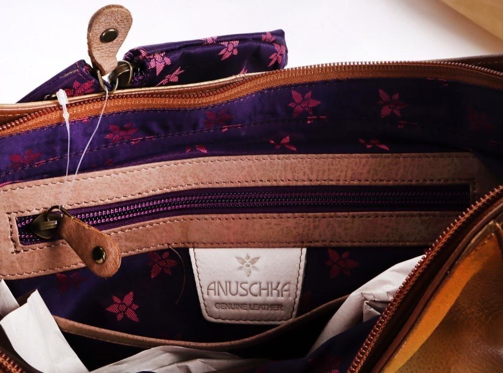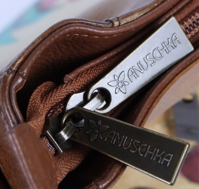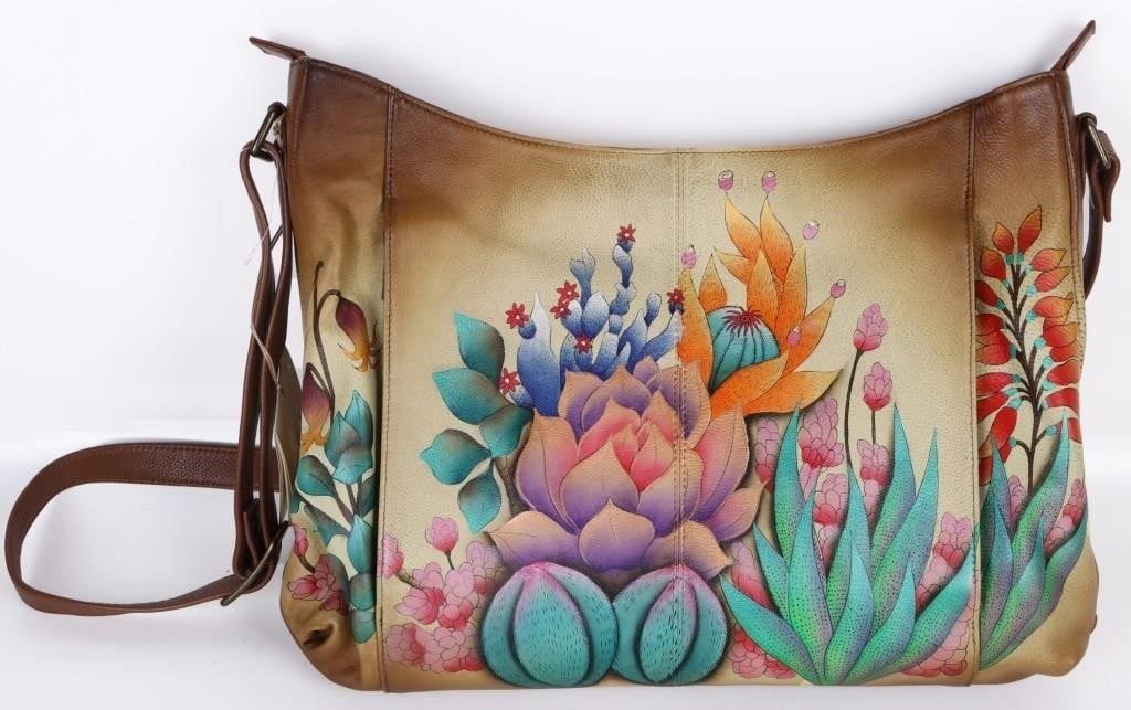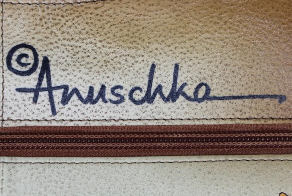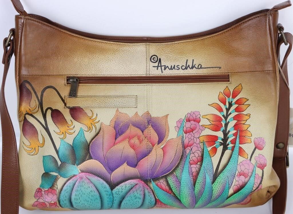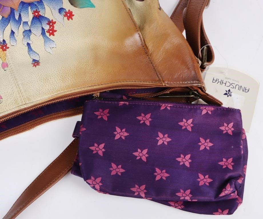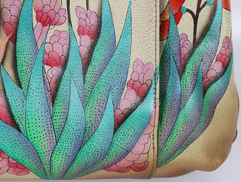 Anuschka Lotus Flower Handbag & Wallet Purse to include the original bag the purse came in, and all items still attached to the purse like new and a beautiful creative Lotus Flower design along the front and back of the handbag made of light leather.