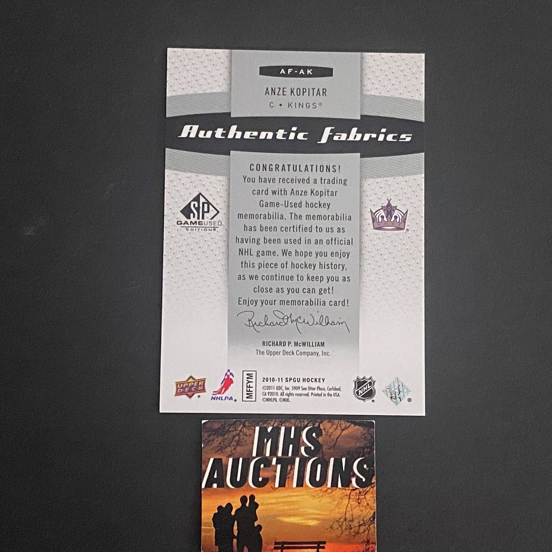 ANZE KOPITAR LOS ANGELES KINGS 2010-11 SPGU HOCKEY JERSEY CARD