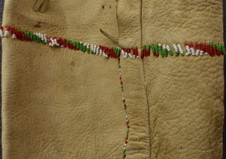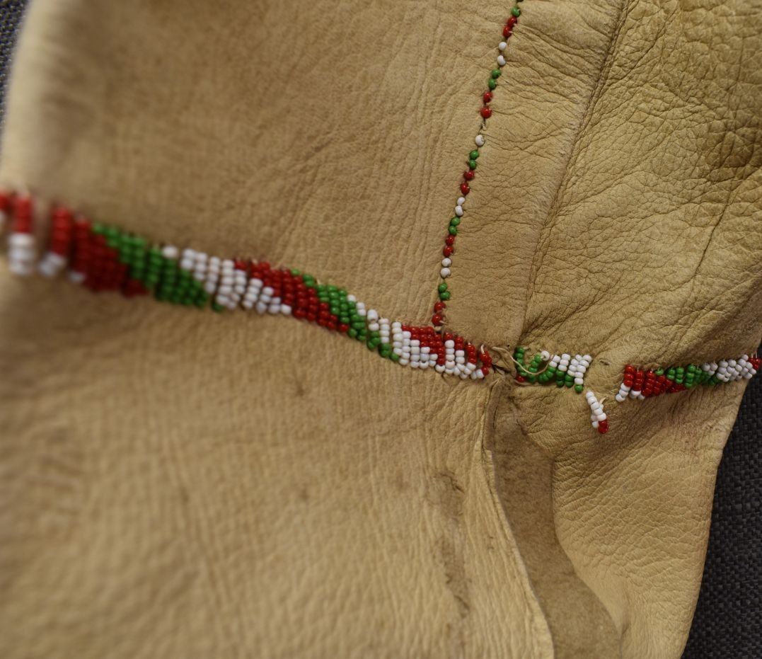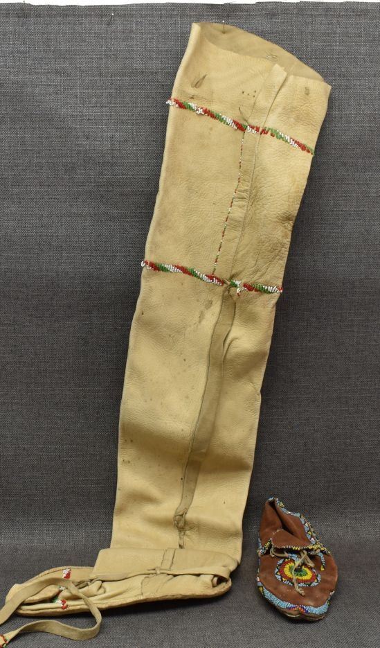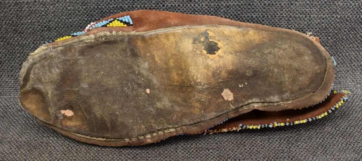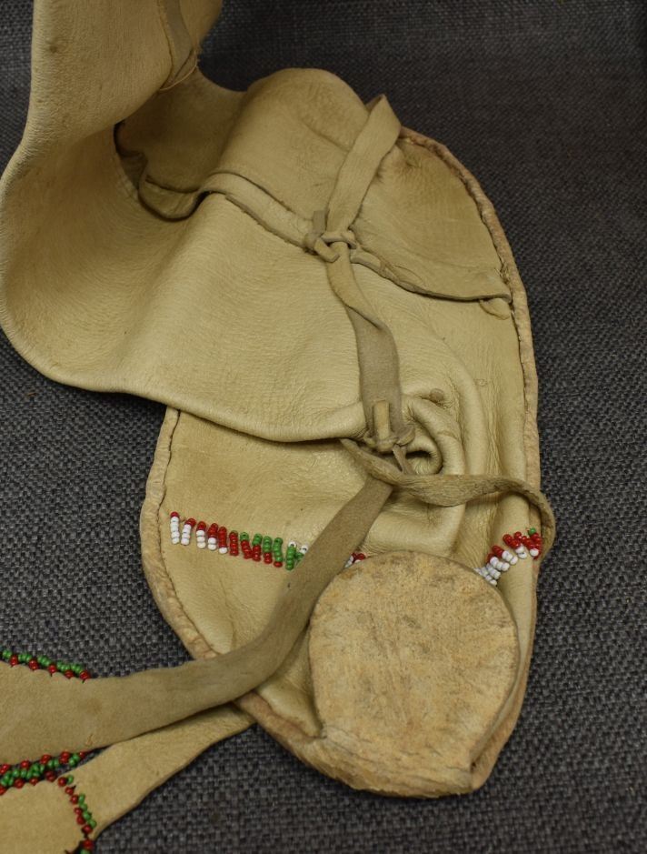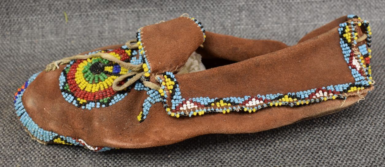 1960's Apache high top moccasin beaded design on commercial leather 33'' x 10'' x 4''. Plains single Moccasin with beaded design on commercial leather.2'' x 9'' x 3''