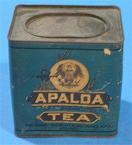 APALOA TEA TIN CANISTER. Paper label shows signs of minor wear and reads “Apaloa Tea, Sears, Roebuck and Co., Chicago”. 7.5” H