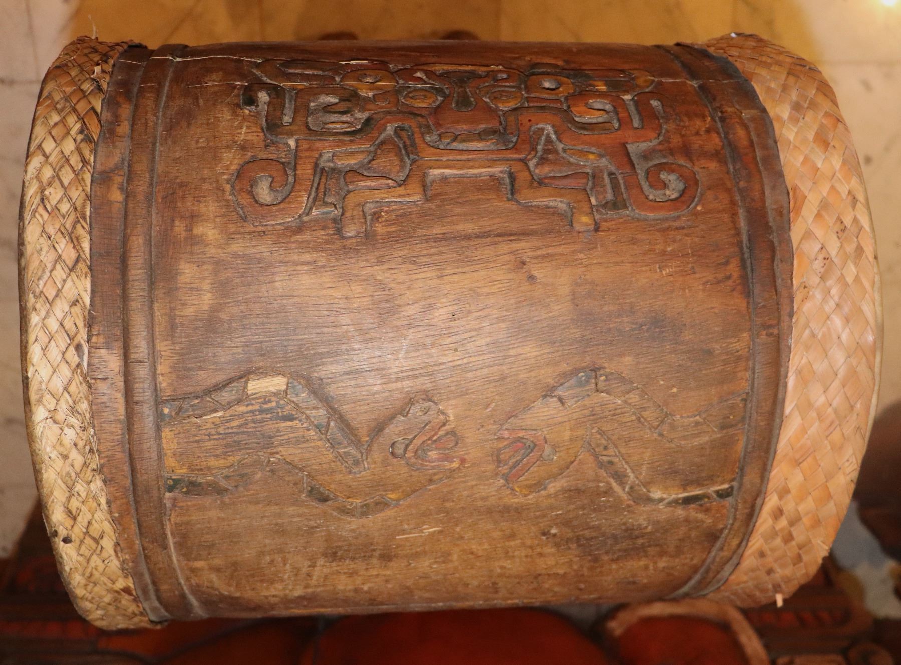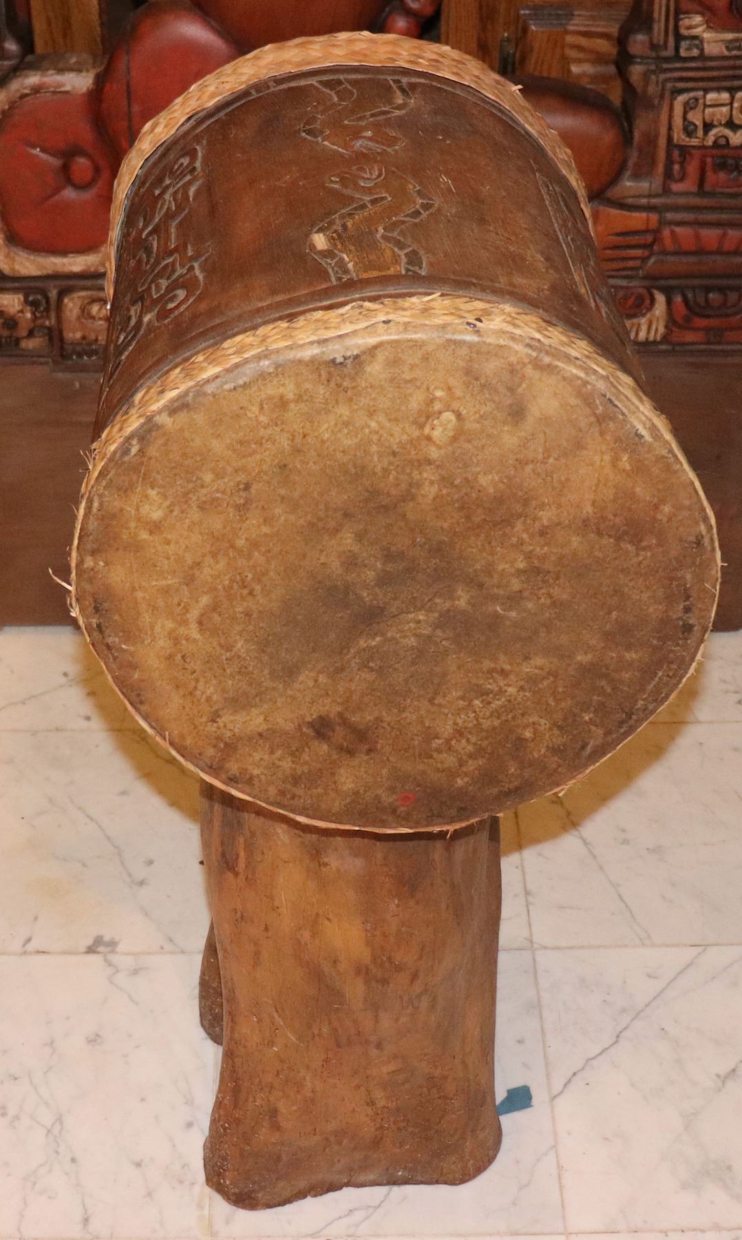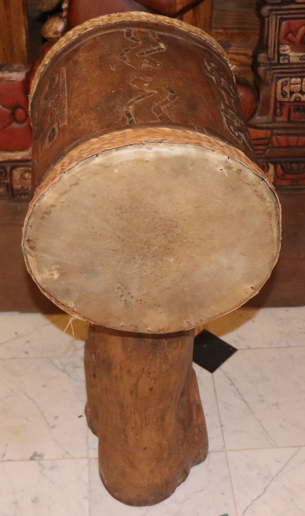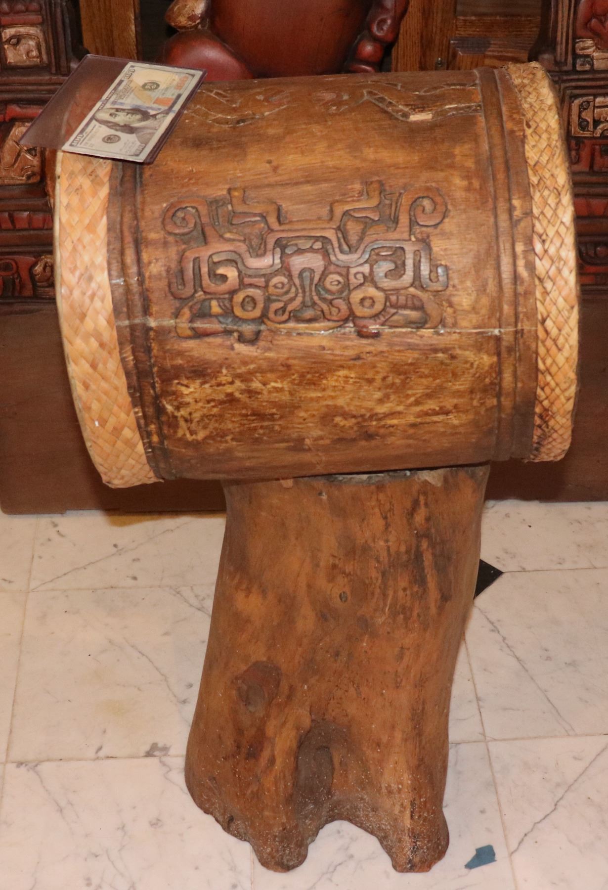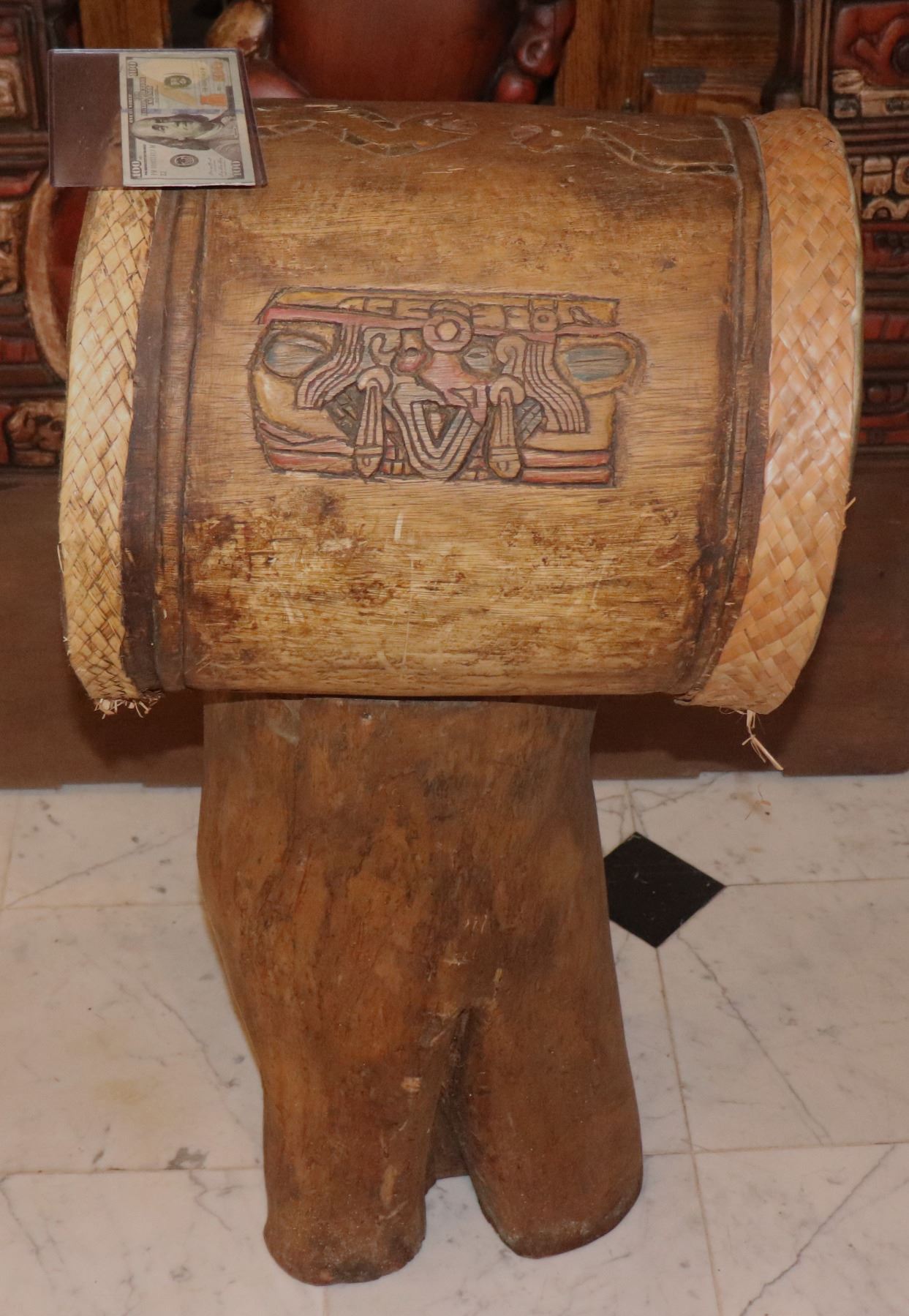 APOCALYPTO MAYAN DRUM WITH BASE HAND CARVED WOOD AND LEATHER