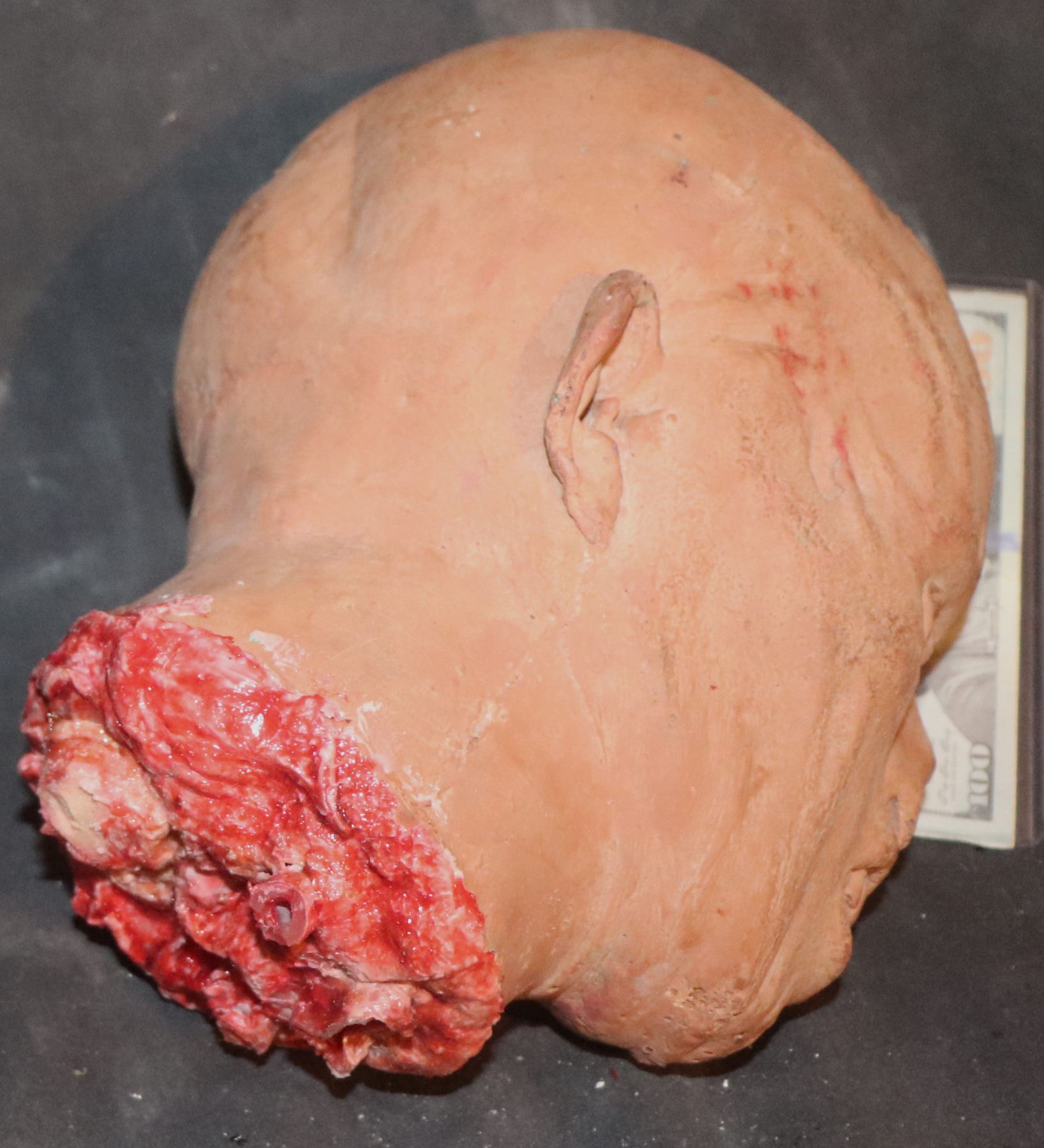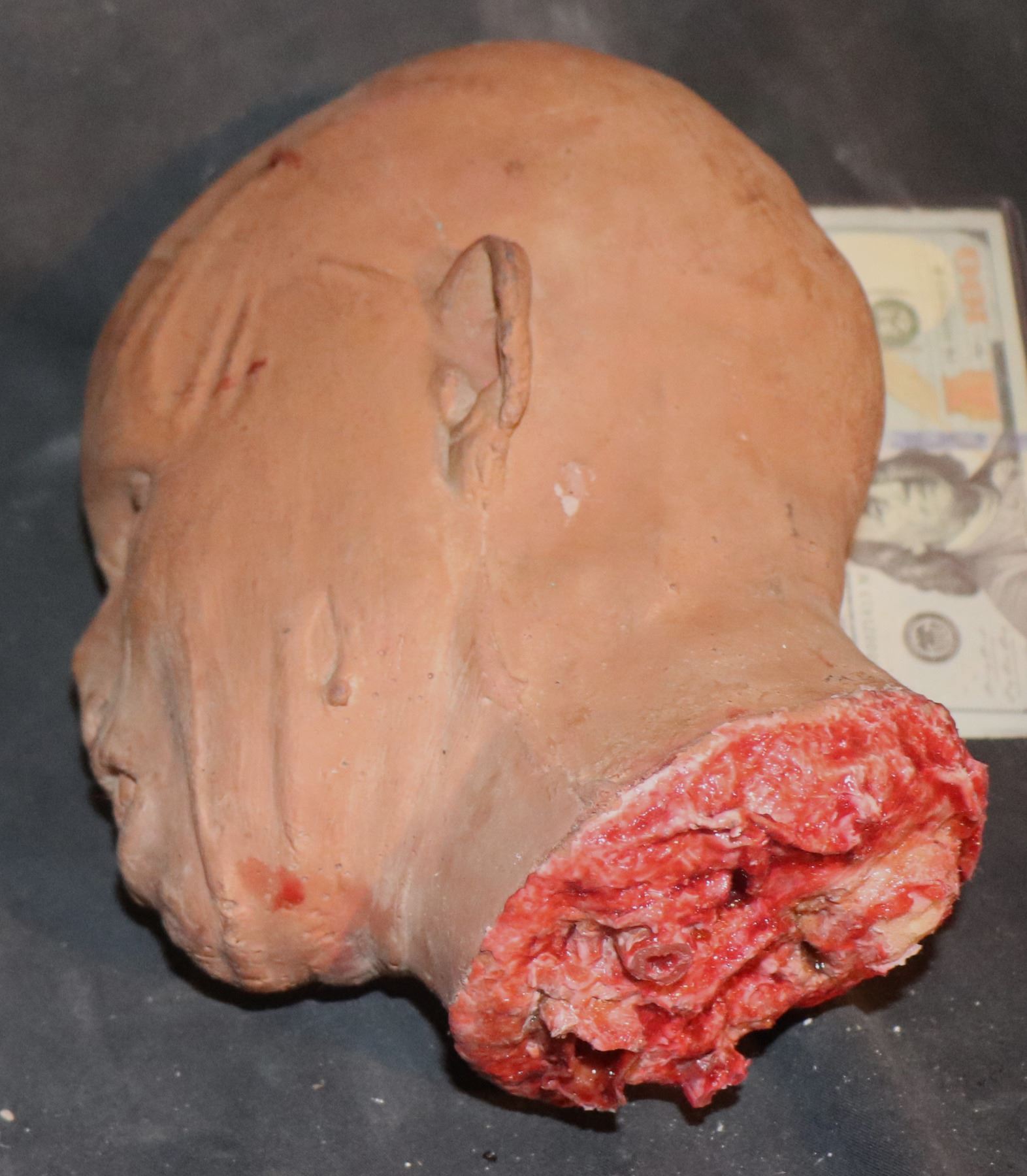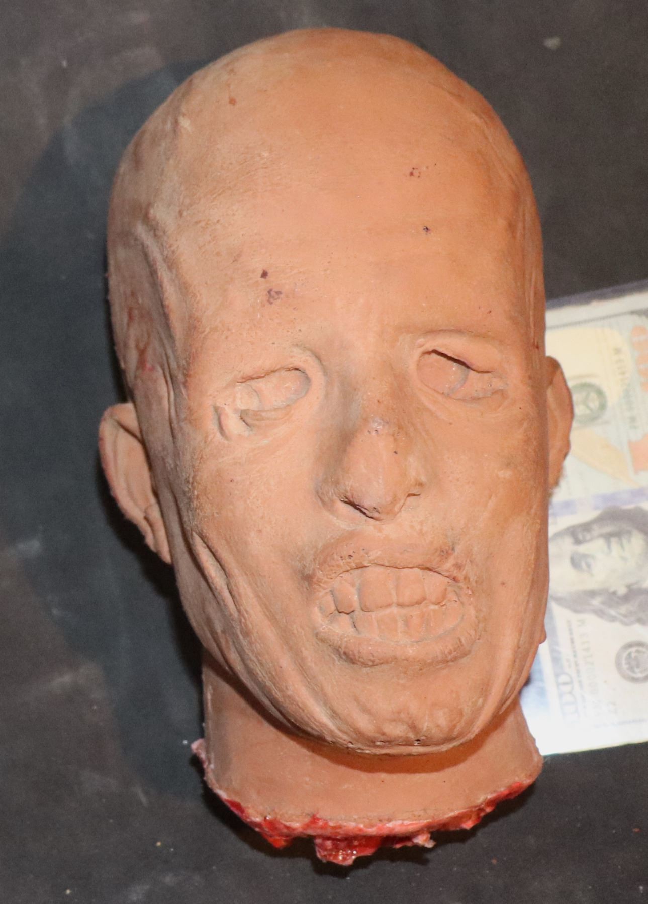 This once had a wig that is now lost. Made of a urethane rubber to bounce down the steps of the Pyramid.