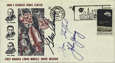 Apollo 10 commemorative postal cover picturing the crew of Apollo 10, mission emblem and lunar spacecraft, with Apollo 8 stamp canceled at Kennedy Space Center, May 18, 1969, boldly signed by astronauts GENE CERNAN, TOM STAFFORD and JOHN YOUNG. Very good.