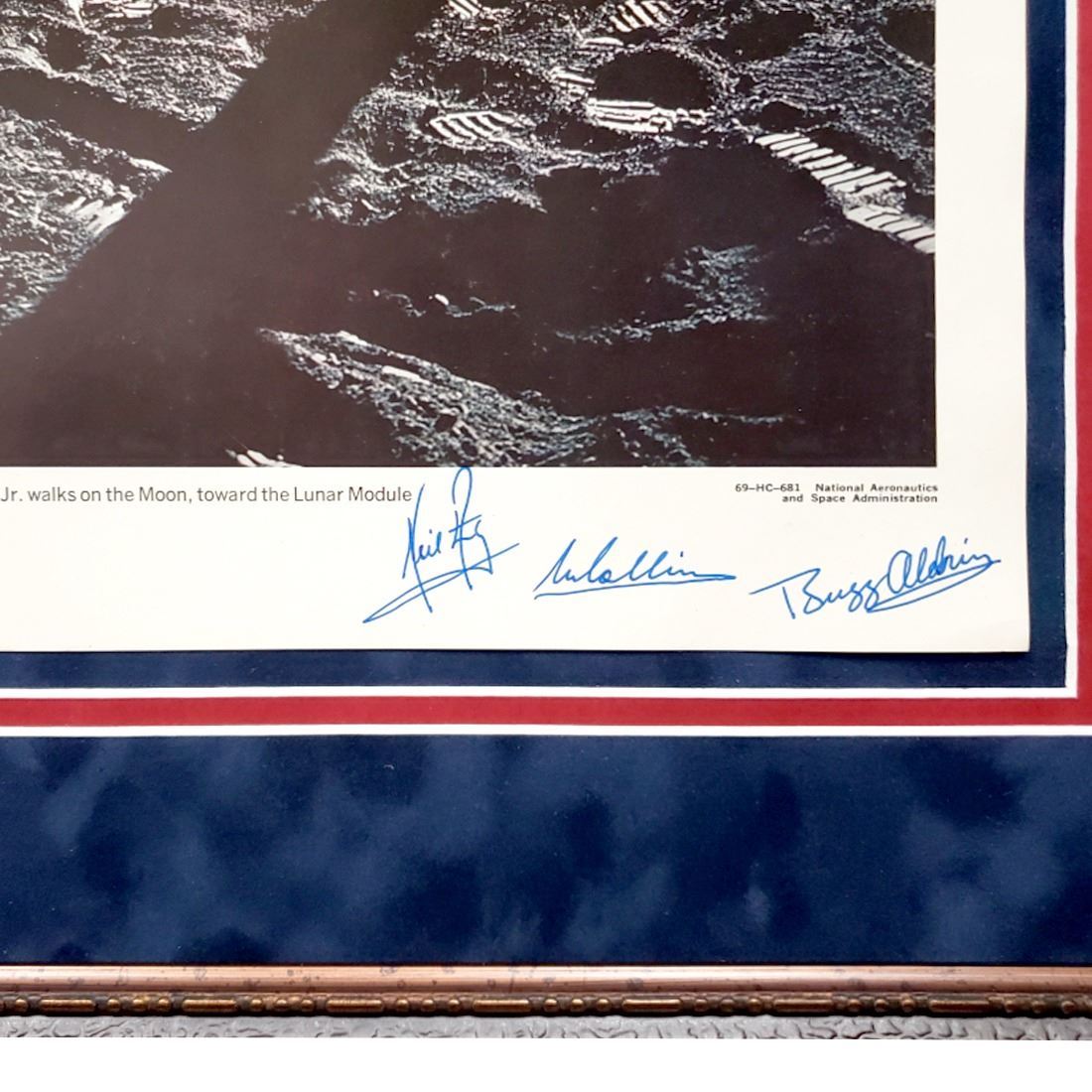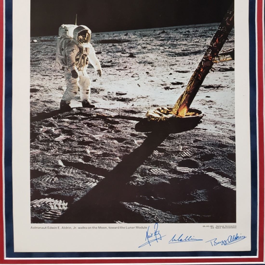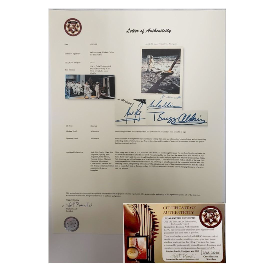 Apollo XI Astronauts signed 11 x 14 Color Space Print Photograph. Three young men, all born in 1930, shared the same dream: To soar through the skies. The one from New Jersey joined the Air Force and the one from Ohio became a U.S. Navy pilot and the one from Italy that was a fighter pilot for the U.S. Air Force. But it wasn’t until they were brought together that they ended up flying higher than they ever dreamed. Buzz Aldrin, Neil Armstrong and Michael teamed up to on a historic Apollo 11 lunar mission in 1969. And on July 20 of that year, Neil Armstrong, and Buzz Aldrin to walk on the moon. As Armstrong so lyrically captured, that momentous occasion was "one small step for man, one giant leap for mankind. The dedication and focus of these three astronauts made them the perfect team to successfully land on the moon on July 20, 1969, and return safely to earth, forever changing the course of how we view our universe. This item has been proffesionally custom matted and framed and comes with a letter of authenticity issued by Guaranteed Forensic Authenticators along with the GFA guarantee of authenticity.