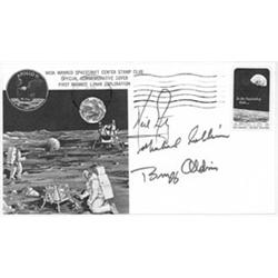 Exceedingly rare commemorative postal cover signed by the three Apollo 11 astronauts, NEIL ARMSTRONG, MICHAEL COLLINS and EDWIN "BUZZ" ALDRIN". The 6 1/2" x 3 3/4" cover bears a color illustration of astronauts with scientific experiments in the foreground, the LEM in the background, with the flight emblem at top. The legend at top reads: "NASA MANNED SPACECRAFT CENTER STAMP CLUB OFFICIAL COMMEMORATIVE COVER FIRST MANNED LUNAR EXPLORATION", with an Apollo 8 stamp at upper-right and postal cancellation at Houston on July 20, 1969, the day the astronauts landed upon the moon. Prior to Apollo 11's launch, these covers were given to the flight crew to sign together while in pre-flight quarantine, to be given to their families should the crew fail to return alive. In such an event, their value would provide "insurance" for their families, hence the term "insurance cover". After signing, the covers were sent to Cape Kennedy and Houston for cancellation. These covers played an important part in the flight, giving the crew confidence that their families would be provided for, and thereby permitting them to focus completely on their mission. A very fine example, from the "Buzz Aldrin Family Space Collection".