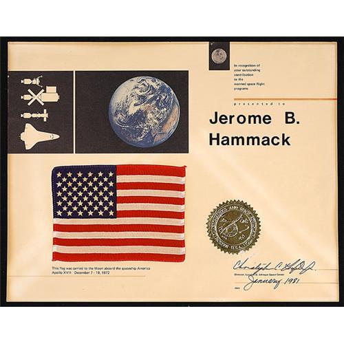 <Our item number 126200><B>APOLLO 17, 1972, FLOWN UNITED STATES FLAG.</B> (6x9") This flag is mounted on a NASA presentation certificate (11x14") that reads: This flag was carried to the Moon aboard the spaceship America, Apollo XVII, December 7-19, 1972". The certificate is also marked: "In recognition of your outstanding contribution to the manned space programs, presented to Jerome B. Hammack, and hand (?) signed Christopher C. Kraft, Director, JSC, January 1981". There is light to moderate toning on the certificate as a result of hanging on a wall for many years and a darker stain around the edges of the certificate from the frame, but an attractive, rare piece of memorabilia. <BR>Estimated Value $3,500 - 5,000. <I><BR>Ex. the NASA Administrator Jerry Hammack Estate collection.</I> <BR><BR>Our item number 126200<BR><IMAGES><P ALIGN="CENTER"><IMG SRC="http://www.goldbergcoins.net/liveauction/49jpegs/126200.jpg"> </P></IMAGES>