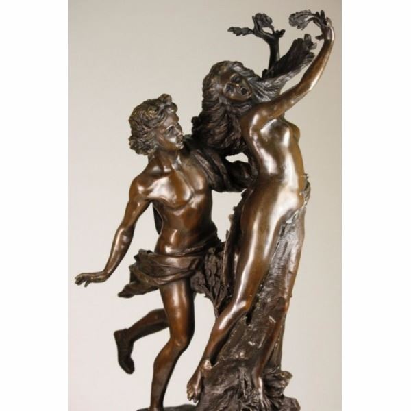 This item selling in Upscale Art Galleries and Museum galleries for up to $3700.00 - $4900.00 when it can be found. This is a sophisticated Piece, perfect for any art lovers home, office, or place of business. Don't miss your opportunity to own this wonderful and rare piece, Buy it Now! Bid with confidence.Think Bronze, takes pride in our superb collection of museum quality Bronze Statues, handpicked from the finest artistry using old world standards around the globe. The attentions to the intricate details of these luxurious works of art are amazing and the brilliance of the figures unsurpassed. From art Nuevo to art deco, wildlife nature to equestrian, classical to contemporary, religious to renascence or nude, you will find a remarkable assortment of diverse Art forms and sizes, coupled with undeniable values makes Think Bronze a fantasy playground for art collector and lover in you.."Apollo and Daphne" This famous sculpture is by the famous Italian sculptor, Giovanni Lorenzo Bernini (1598-1680). It was inspired by one of the stories included in Ovid's Metamorphoses. The Story Behind the Sculpture: In the story, Apollo, god of prophecy, sees the young Eros, god of love, playing with his bow and arrows and remarks, "What have you to do with warlike weapons? Leave them for hands worthy of them." In retribution for this reproach, Eros wounds Apollo with a golden arrow, causing him to fall in love with the nymph daughter of the river God, Peneus. Eros additionally wounds the beautiful nymph, Daphne, with a lead arrow, thus insuring she would not be wooed by Apollo's advances. (In fact, the arrow's power was so strong that Daphne forthwith refused all of her lovers.) Apollo, struck with the golden arrow of love, pleads with Daphne to fulfill his desire. Daphne, repulsed by the idea, begins to flee. Even as she runs, he is more captivated by her beauty. Apollo grows impatient and soon, sped by Eros, gains on her. With slower speed and failing strength, Daphne cries out to her father just as Apollo captures her. Not a moment later, Daphne's skin turns to bark, her hair leaves, her arms branches, her feet roots, and her face a treetop. In only a moment, Peneus protects his daughter by turning her into a laurel tree. After the transformation Apollo still embraces the tree. He cuts off some of her branches and leaves to make a wreath and proclaims the laurel as a sacred tree. Bernini's sculpture captures Daphne's transformation with intense emotion and drama by portraying the different stages of her changes. The interlocking components and chiaroscuro create more narrative, reflecting foundations of Hellenistic Greek art. Cast in bronze and signed "Bernini." About the Artist: Giovanni Lorenzo Bernini (December 7, 1598 - November 28, 1680) was a pre-eminent Baroque sculptor, architect, and painter of 17th Century Rome. He was the son of a sculptor and studied with his father who also helped him gain early patronage. Extensive patronage from the powerful Borghese and Barberini families contributed to his notoriety, but, from the beginning, Bernini was a virtuosic sculptor. For Cardinal Scipione Borghese, he produced a series of sculptures of subjects from Ovid's Metamorphoses and from the Bible (1618-25). These works show Bernini's ability to use the observer's space to expand the possibilities of sculpture beyond the medium itself. Apollo and Daphne, for instance, shows Daphne trying to escape from the pursuing Apollo and turning into a laurel tree as she does so. The observer must walk around the sculpture to witness Daphne's transformation, thus denying a unitary viewpoint. This type of multiple viewpoint was common in Mannerist sculpture.Condition: This sculpture is in a very Good condition. Bronze Dimensions with Marble Base:Height 23" x Width 20"Marble Dimensions:10 1/2" X 8"Height without base:22" Weight :40 LBSInventory : 69-190B43096 This item selling in Upscale Art Galleries and Museum galleries for up to $3700.00 - $4900.00 when it can be found. This is a sophisticated Piece, perfect for any art lovers home, office, or place of business. Don't miss your opportunity to own this wonderful and rare piece, Buy it Now! Bid with confidence.Think Bronze, takes pride in our super