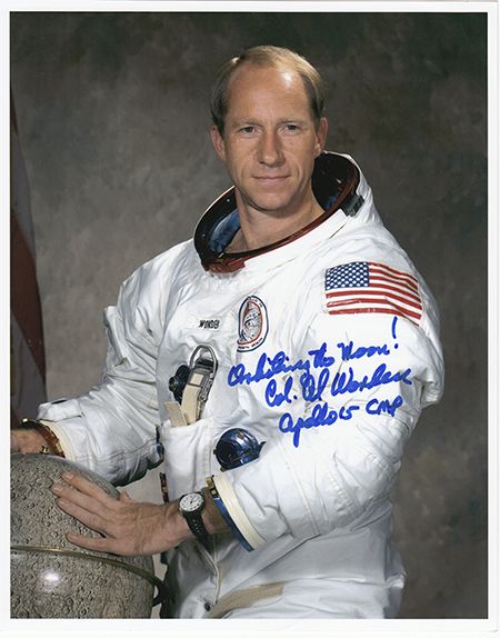 Lot of three items siogned by early astronauts, includes: AL WORDEN S.P. 8" x 10" color, a half-length view in pressure suit, inscribed: "Orbiting the Moon! Col. Al Worden Apollo 15 CMP". Sold with two Apollo 11 moon landing first day covers cancelled July 20, 1969, individually signed by JIM IRWIN and ED MITCHELL. Three pieces, fine.