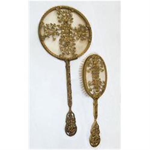 The Apollo Studios produced this lovely hand mirror and hairbrush dresser set during the early 1900s. Featuring heavy intricate ormolu or brass, reticulated filigree with floral openwork with a beige satin lining beneath. The beveled hand mirror measures 14 1/2 inches long - the hair brush 10 1/4 inches.With only slight wear to the silk, due to age, this old dresser set is still in excellent condition.