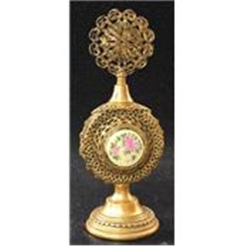 Produced by APOLLO, circa 1920s this superb ormolu or brass perfume bottle, features an intricate filigree designed stopper, with attached dauber that fits inside a screw-in bronze capped canister that contains the perfume, and filigreed bottle which is further adorned with an applied flower. Centered on the bottle is a 1 1/2 inch yellow goulloche medallion protected by celluoid and with painted pink roses. Marked APOLLO underneath this exceptional perfume bottle measures 7 1/2 inches tall including its stopper and the entire piece, only slightly tarnished due to age, is in excellent condition