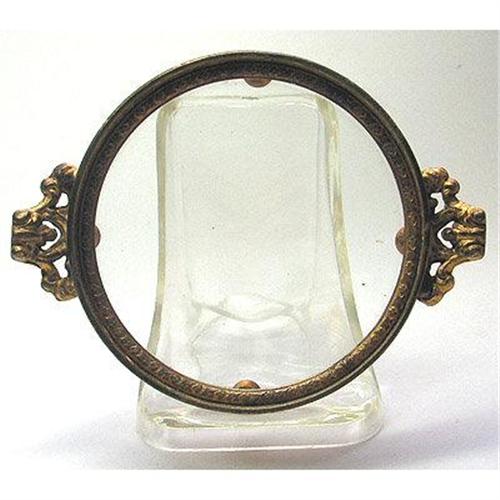 This gilded brass and glass perfume bottle tray or vanity tray was produced by the APOLLO Studios during the early years of the 20th century and marked. Measuring about 4 1/2 inches across from handle to handle. Featuring a scroll work decorated rim, handles with a floral design and with roses where the handles attach and a lace doily sandwiched between two panes of glass. Stands on four ball feet and excepting for minor tarnishing to the gilded brass, due to age, is in excellent condition. Marked APOLLO 2695 - 4