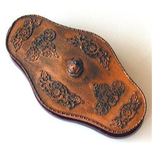 This Art Deco vanity or dresser make-up compact was produced by the Apollo Studios during the 1920s. The intricately crafted filigree top is adorned with symmetrically placed intricately patterned medallions - the sides are further adorned with floral and scrollwork friezes - marked on the inside - Apollo Made in the USA 2958. The burnt orange heavy Depression glass base was produced by the Cambridge Glass Co. It has four compartments for powder & puff, eyebrow pencil, lipstick and rouge. Measuring 8 3/4 inches long x 4 3/4 inches wide x 3 1/2 inches tall to top of the finial and with only mild patina wear this wonderful and very hard to find Art Deco, ormolu, brass or bronze dresser make-up compact is entirely in excellent condition.