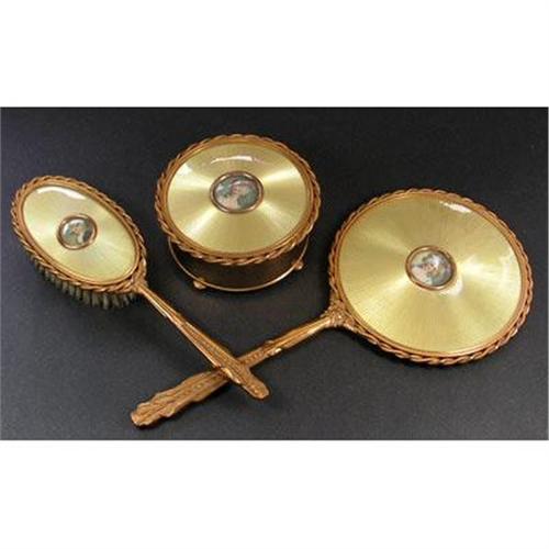 Produced by APOLLO, circa 1920s this ornate ormolu or brass golden with guilloche enamel dresser set consists of a 14 inch long x 7 1/2 inch round hand mirror with beveled glass, a 10 1/2 inch long x 4 12 inch oval hair brush, with natural bristles and a 5 inch round powder jar with glass insert and down puff. Each piece is adorned with a 1 1/2 inch round Victorian Lady portrait under celluloid. The golden guilloche enamel backs are rimmed with braiding and the handles are beautifully sculpted. They are labeled APOLLO and numbered, the hair brush is imprinted - PURE BRISTLES STERILIZED - the jar is also stamped APOLLO. There is not any tarnishing or any damage. They are all in pristine condition.