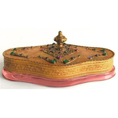 This fantastic Art Deco jeweled vanity or dresser make-up compact was produced by and for the 'Apollo' Jewelry Store, NYC during the 1920s. The intricately crafted filigree top is adorned with symmetrically set faux glass jewel emeralds, sapphires, amethysts, and rubies - the sides are adorned with floral and scrollwork friezes - marked on the inside 'Apollo Made in the USA 2954'. The pink heavy Depression glass base was produced by the Cambridge Glass Co. and is marked 'PAT. APPL'D FOR'. It has four compartments for powder & puff, eyebrow pencil, lipstick and rouge. Measuring 8 3/4" long x 4 3/4" wide x 3 1/2" tall to top of the finial and with only mild patina wear this wonderful and very hard to find Art Deco jeweled, ormolu, brass or bronze dresser make-up compact is entirely in excellent condition.
