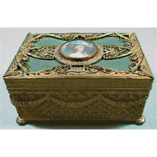 Produced by the Apollo Studios of New York, circa 1920, this superb ormolu jewelry box, with teak liner, features beautiful floral filigree and etched designs both on the base and lid. Also featuring on the lid is a very lovely and unusual covered 2" round hand painted portrait of a young Victorian lady, in very fine detail. Quite heavy and measuring 5" x 3 1/2" x 2 1/4, marked on the bottom 'APOLLO - Made in USA - 2989' and with the exception of slight wear to the patina, due to age, is in excellent condition.