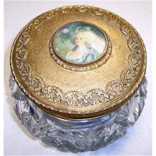Produced by Apollo Studios, c1900, and features alid with a portrait of a Victorian lady in period costume. The base is high quality EAPG or cut glass and the two together makes a striking combination. Measures 4 3/4 inches in diameter x 3 1/2 tall, marked Apollo - MADE IN U.S.A. - 2967 and, with the exception of some tarnishing, due to age, and a crack running through the celluloid protective covering over the portrait, is in excellent condition for its age.