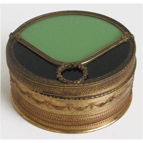 Produced by APOLLO, circa 1920s this superb Art Deco ormolu or brass dresser jar, with crystal liner, features an amazing lid with jadeite and jet glass sections separated with applied brass adornments. The side is embellished with several ornate friezes of beads, scrollwork, etc. Marked APOLLO on the bottom. This exceptional vanity jar measures just under 5 inches in diameter x 2 1/4 inches tall including the lid and the entire piece, although a little tarnished and worn due to age, is in excellent condition