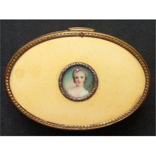 Produced by, Apollo of New York, circa 1910, this oval brass or ormolu, portrait jewelry or dresser box, features a lid with floral openwork and a large, centered, prong set, faceted, green glass jewel all over a celluloid covering with a beige satin lining beneath. The Interior is lined in beige velvet. The box features an enamel lid bordered in ormolu or brass with a central brass bordered 1 1/2 inch signed hand painted portrait of a beautiful young lady. Marked on the Bottom ? APOLLO. Measures 6 inches wide x 4 inches deep x 2 inches tall, sits on four balled feet and, with the exception of some wear and a little staining to the enamel and to the interior velvet, is in excellent condition.