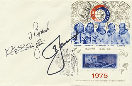 Fine Soviet commemorative cover honoring Apollo-Soyuz, cancelled Aug. 15, 1975, boldly signed by: ALEXEI LEONEV, VALERI KUBASOV, TOM STAFFORD and DEKE SLAYTON. Very good.