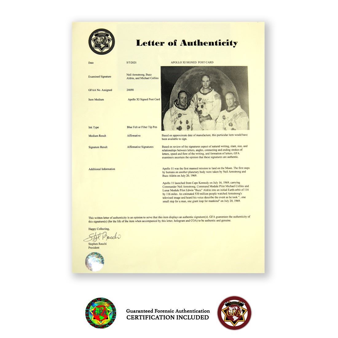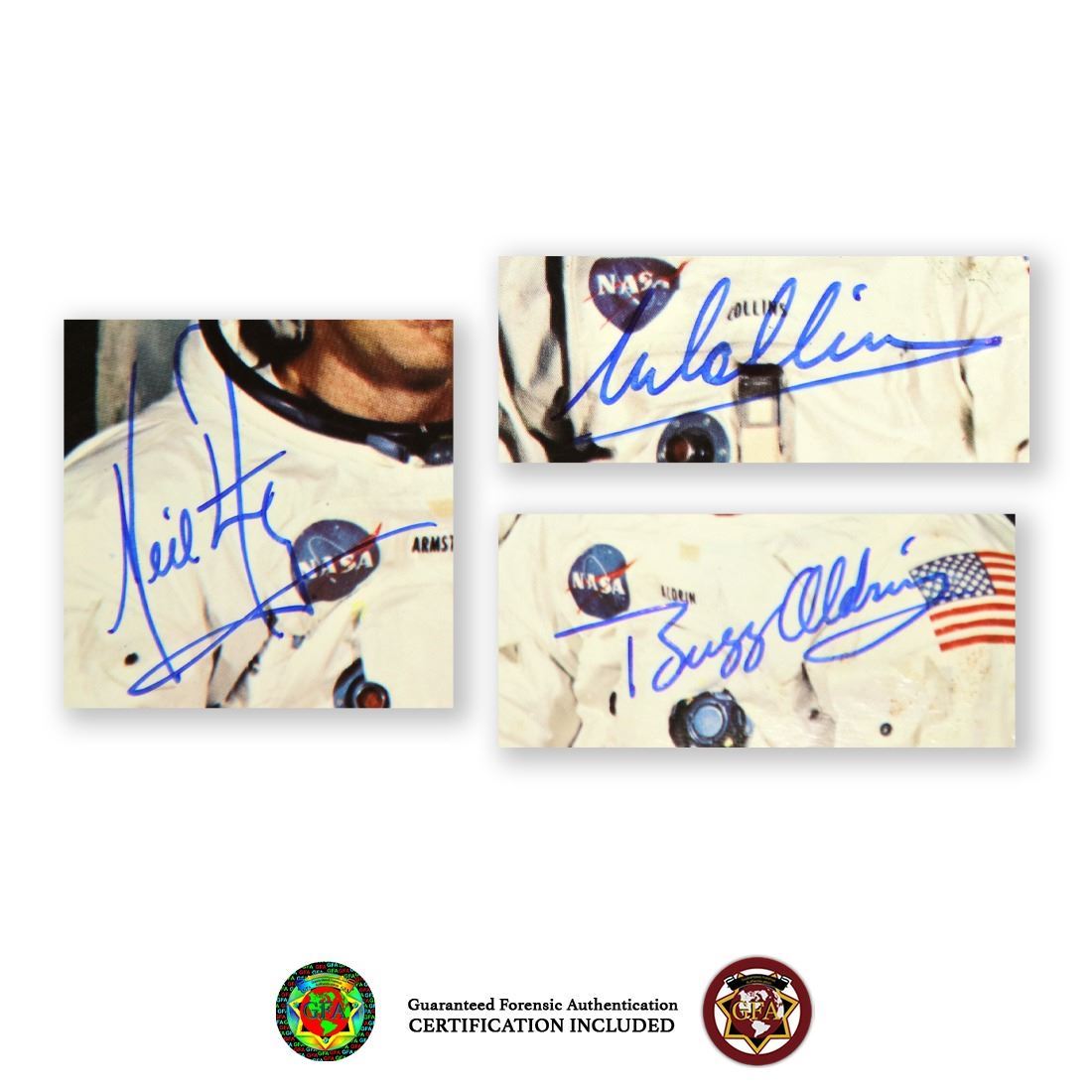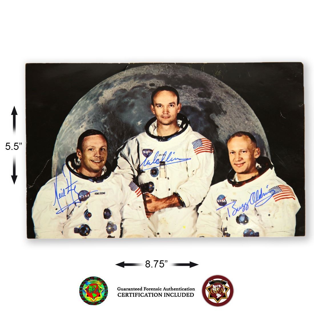 Neil Armstrong (August 5, 1930-August 25, 2012), Buzz Aldrin (January 20, 1930) and Michael Collins (October 31, 1930-April28, 2021) signed5.5 x 8.75 color photograph of the Apollo XI Astronauts. All three signatures are signed boldly in blue ink. The primary objective of Apollo 11 was to complete a national goal set by President John F. Kennedy on May 25, 1961: perform a crewed lunar landing and return to Earth. Apollo 11 launched from Cape Kennedy on July 16, 1969, carrying Commander Neil Armstrong, Command Module Pilot Michael Collins and Lunar Module Pilot Edwin "Buzz" Aldrin into an initial Earth-orbit of 114 by116 miles. An estimated 650 million people watched Armstrong's televised image and heard his voice describe the event as he took "...one small step for man, one giant leap for mankind" on July 20, 1969.The flight plan called for the first EVA to begin after a four-hour rest period, but it was advanced to begin as soon as possible. Nonetheless, it was almost four hours later that Armstrong emerged from the Eagle and deployed the TV camera for the transmission of the event to Earth. At about 109 hours, 42 minutes after launch, Armstrong stepped onto the moon. About 20 minutes later, Aldrin followed him. The camera was then positioned on a tripod about 30 feet from the LM. Half an hour later, President Nixon spoke by telephone link with the astronauts. Comes with a Letter of Authentication from Guaranteed Forensic Authenticators (GFA), along with the GFA guarantee of authenticity.