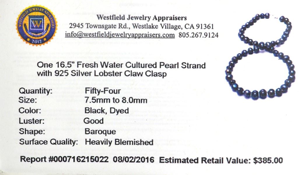 18'' Black Dyed Pearl Strand with Sterling Silver Clasp Necklace