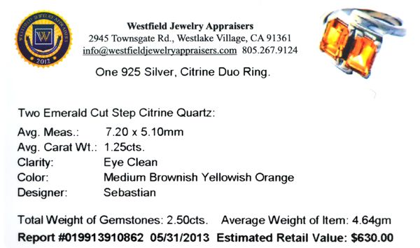 Designer Sebastian 2.50CT Emerald Cut Step Citrine Quartz and Sterling Silver Ring