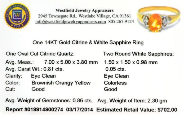14 kt. Gold, 0.81CT Oval Cut Citrine Quartz Ring