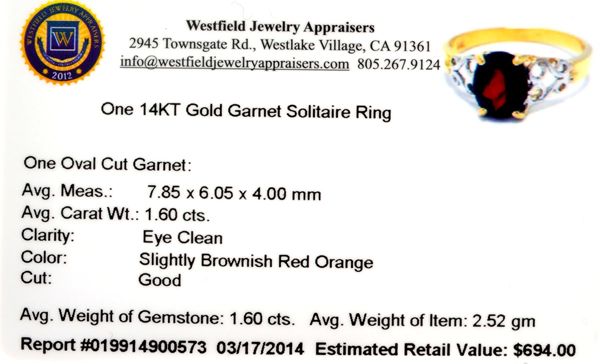 14 kt. Gold, 1.60CT Oval Cut Garnet Ring