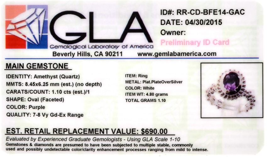 APP: 0.7k Fine Jewelry 1.10CT Oval Cut Amethyst Quartz And Platinum Over Sterling Silver Ring