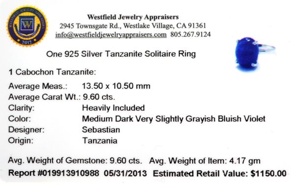 Designer Sebastian 9.60CT Cabochon Tanzanite and Sterling Silver Ring