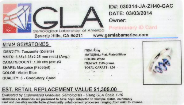 1.00CT Marquise Cut Tanzanite And Platinum Over Sterling Silver Ring