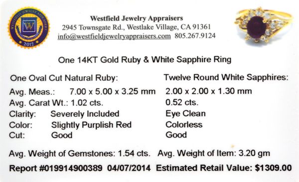 14 kt. Gold, 1.02CT Oval Cut Ruby And White Sapphire Ring