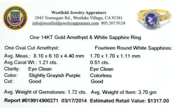 APP: 1.3k 14 kt. Gold, 1.21CT Oval Cut Amethyst Ring