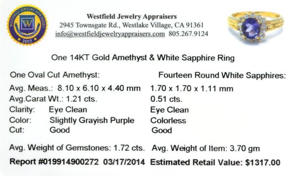 APP: 1.3k 14 kt. Gold, 1.21CT Oval Cut Amethyst Ring