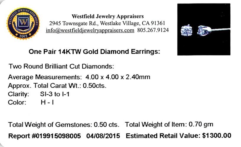 *Fine Jewelry 14 kt. White Gold, Custom Made 0.50CT Round Brilliant Cut Diamond Earrings (VGN A-11) (Vault V)