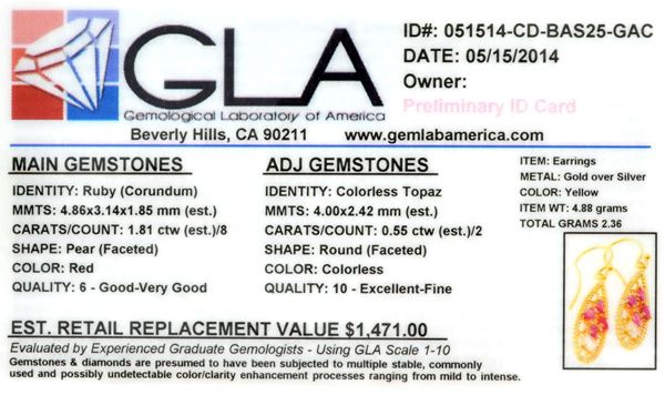 1.81CT Ruby And Topaz Gold Over Sterling Silver Earrings