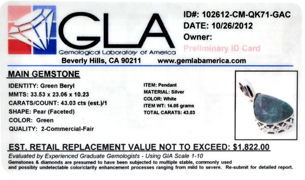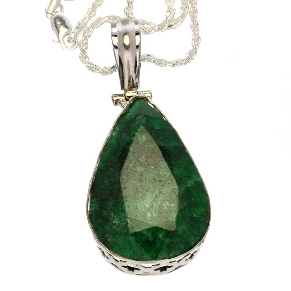 43.03CT Pear Cut Green Beryl and Sterling Silver Pendant and Chain
