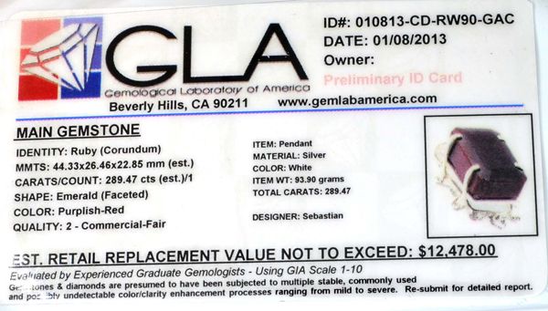 Designer Sebastian 289.47CT Emerald Cut Ruby and Sterling Silver Pendant