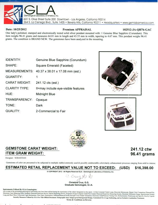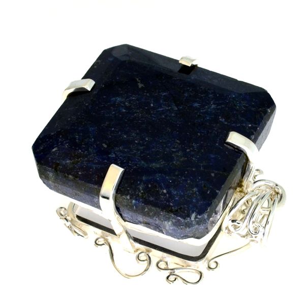 Designer Sebastian 241.12CT Square Cut Blue Sapphire and Sterling Silver Pendant