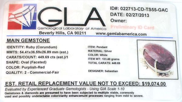 Designer Sebastian 449.69CT Oval Cut Ruby and Sterling Silver Pendant