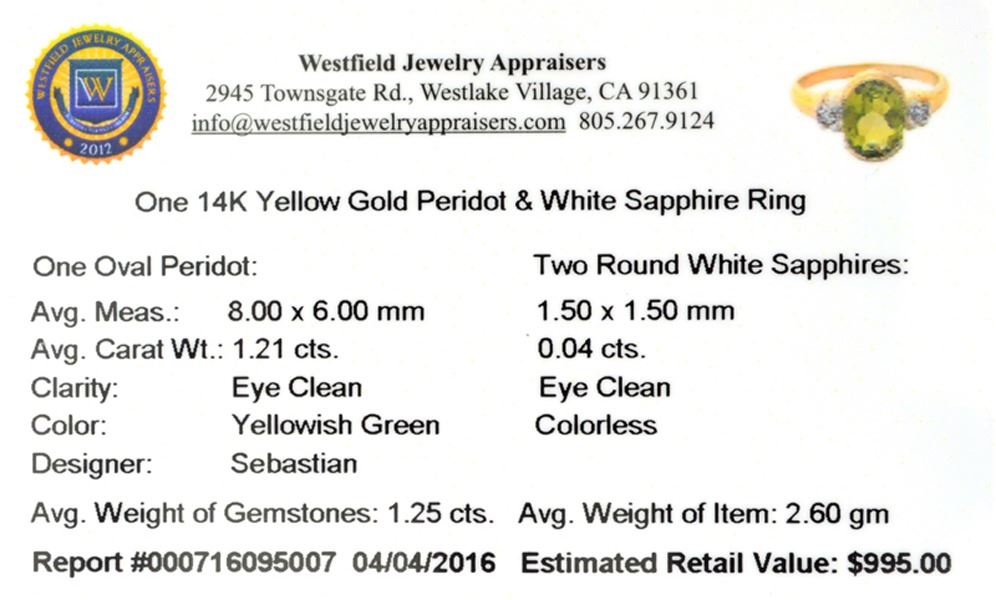 APP: 1k Fine Jewelry Designer Sebastian 14 KT Gold, 1.25CT Green Peridot And White Sapphire Ring