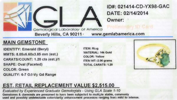 14 kt. Gold, 1.20CT Oval Cut Emerald Ring