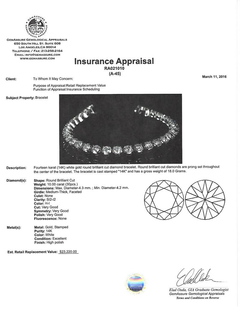 *Fine Jewelry 14 kt. White Gold, Custom Made, 10.00CT Round Brilliant Cut Diamond Bracelet (VGN A-45) (Vault V)