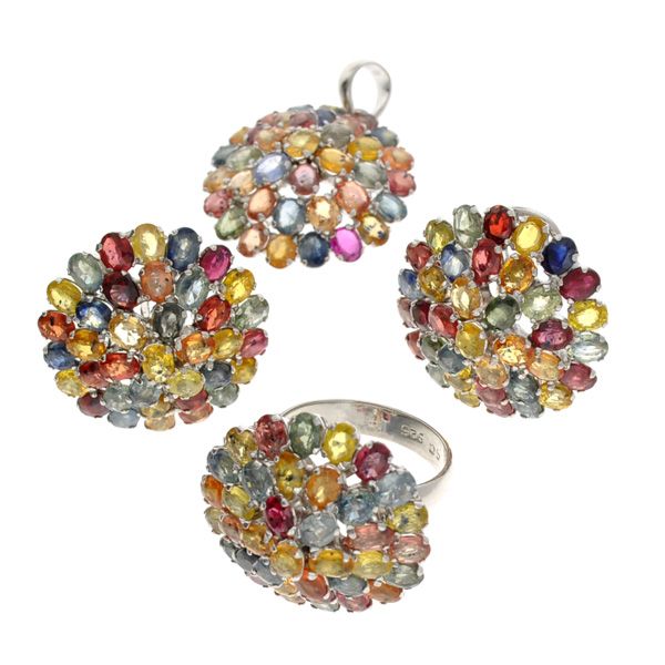 47.35CT Oval Cut Multi Semi-Precious Gemstone and Sterling Silver Ring, Pendant, and Earrings Set