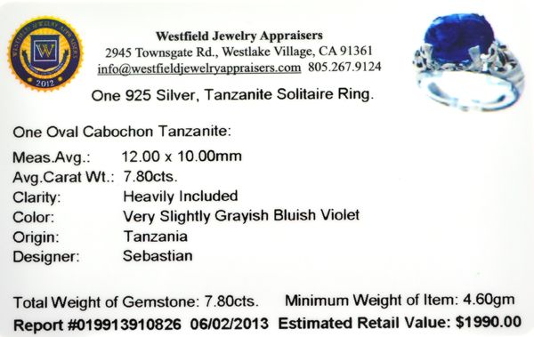 Designer Sebastian 7.80CT Oval Cut Cabochon Tanzanite and Sterling Silver Ring