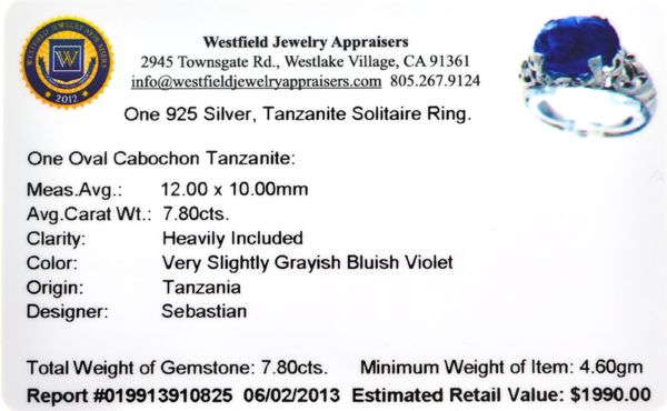 Designer Sebastian 7.80CT Oval Cut Cabochon Tanzanite and Sterling Silver Ring